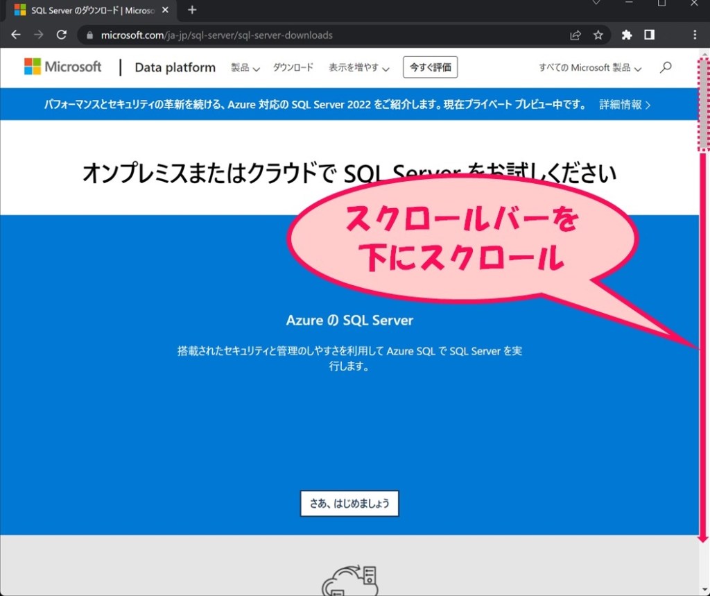 ブラウザを開き「SQL Server」と検索すれば、MicrosoftのWEBサイトにある「SQL serverのダウンロード」のページが検索に引っ掛かるので、クリックしてサイトにアクセスします。