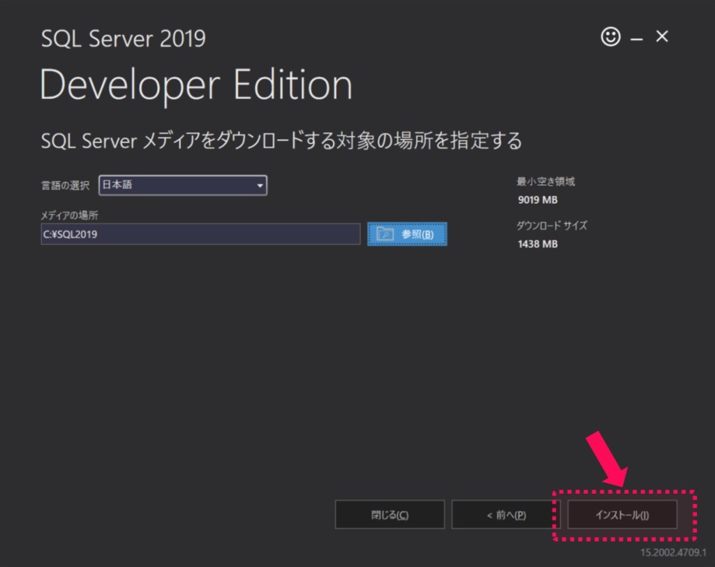 ダウンロードしたexeファイル「SQL2019-SSEI-Dev.exe」をダブルクリックして実行します。