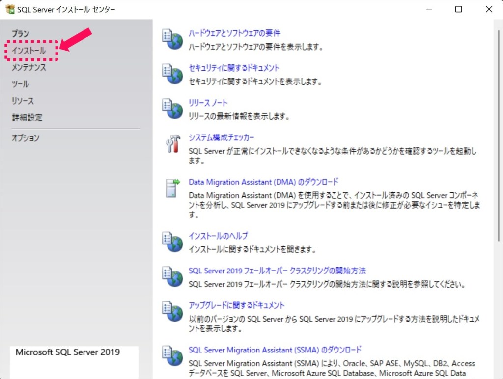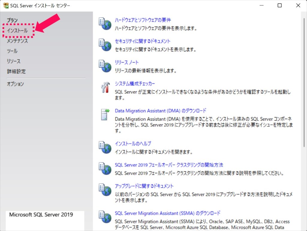 SQL Server インストールセンターの画面が起動したら、左ペインの「インストール」をクリックします。