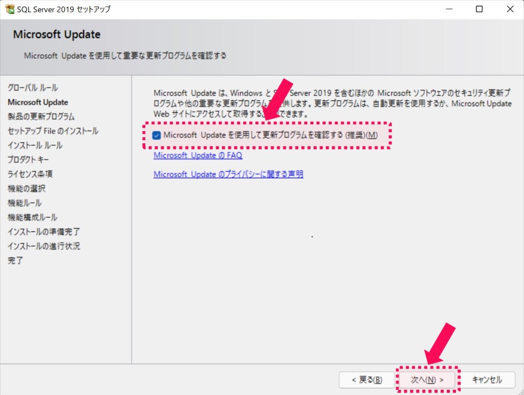 「Microsoft Update を使用して更新プログラムを確認する(推奨)(M)」にチェックを入れて「次へ(N) > 」のボタンをクリックします。