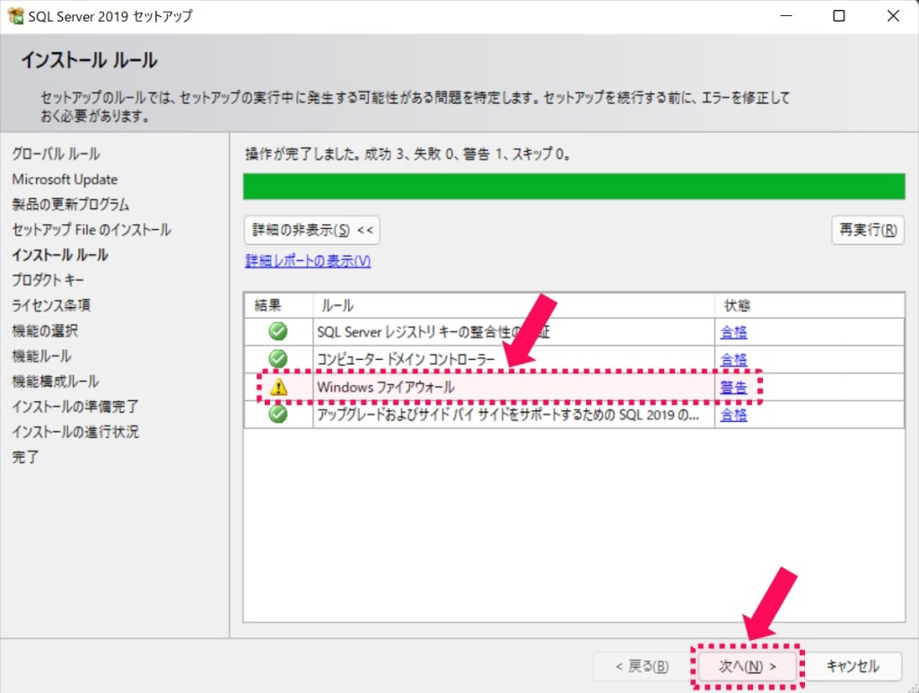 この時「Windows ファイアウォール」の項目で「警告」が表示されますが、気にせず「次へ(N) > 」ボタンをクリックします。
