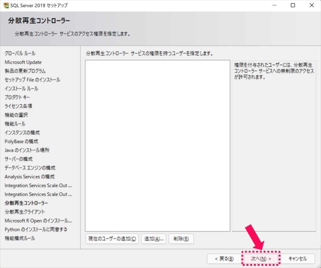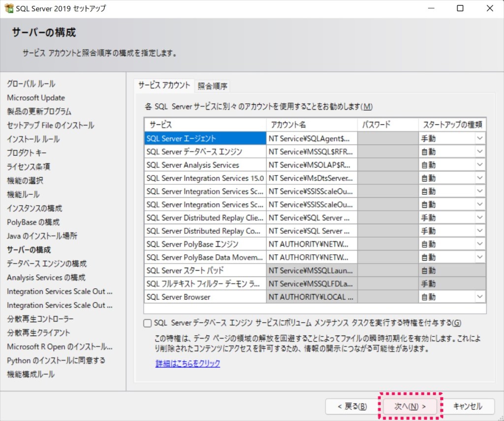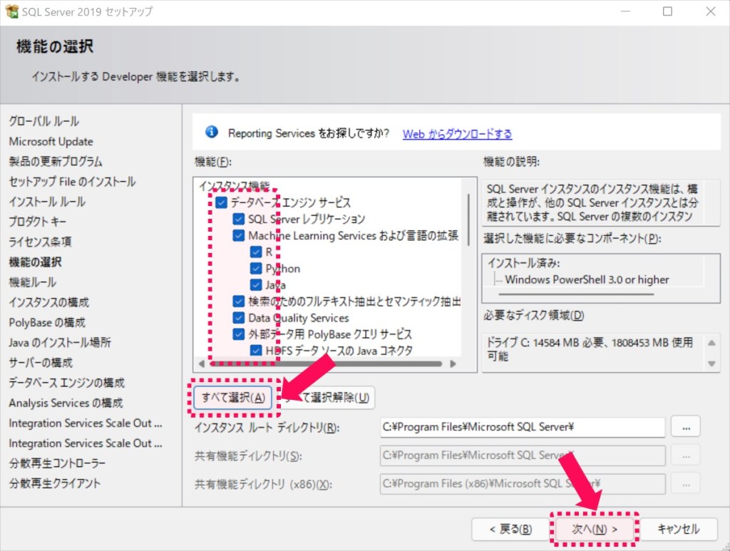 ※2025.4.4追記 機能の選択で「すべて選択」していますが「PolyBase」を使用しないのであれば「外部データ用PolyBaseクエリサービス」のチェックははずしてください。