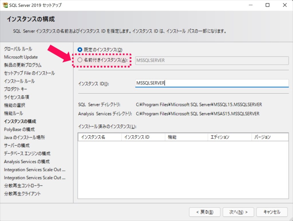 「名前付きインスタンス(A):」を指定するとインスタンス名を入力できるようになります。