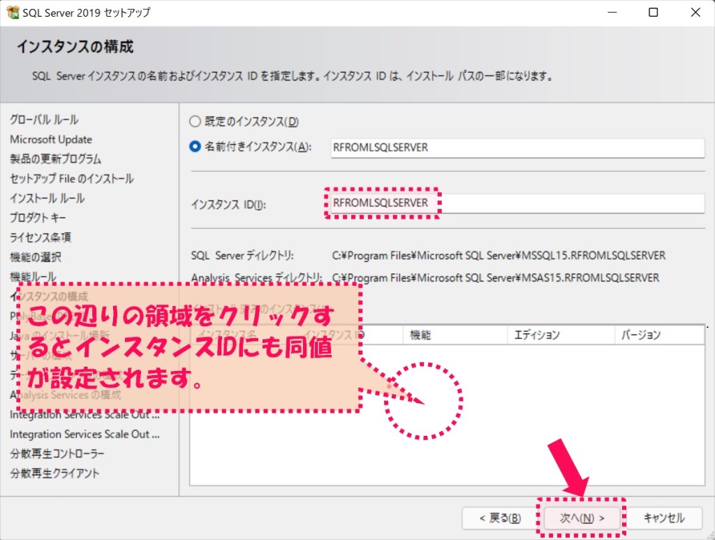 デフォルトのインスタンス名は「MSSQLSERVER」となっていますが、インスタンス名は好きな名前を指定できます。今回は例として「RFROMLSQLSERVER」に変更します。