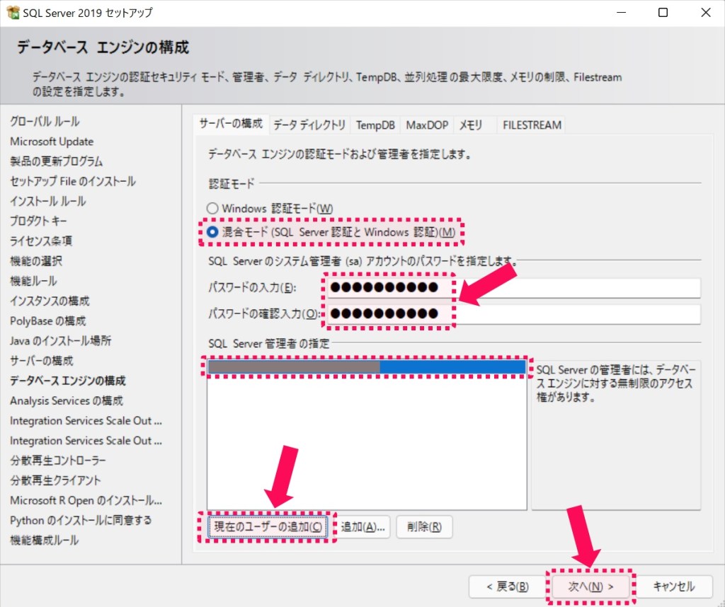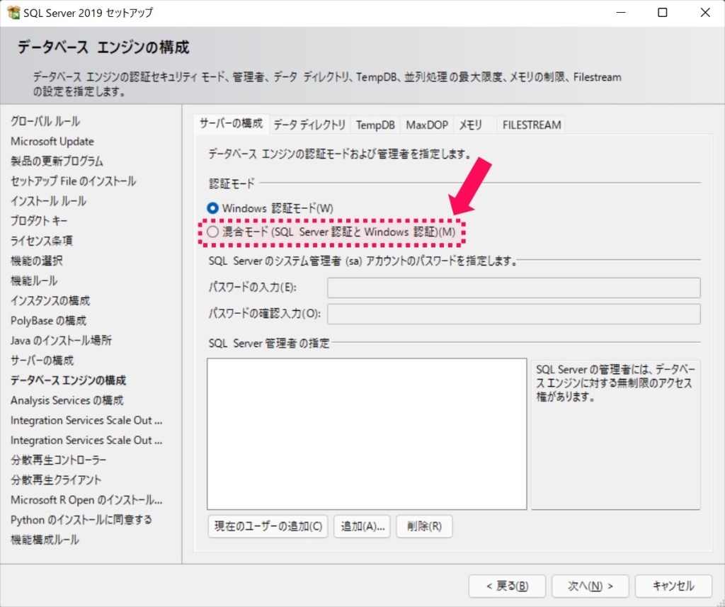 「混合モード(SQL Server 認証と Windows認証)(M)」を選択を選択したら「パスワードの入力(E)」欄と「パスワードの確認入力(O)」欄にパスワードにしたい値を入力します。