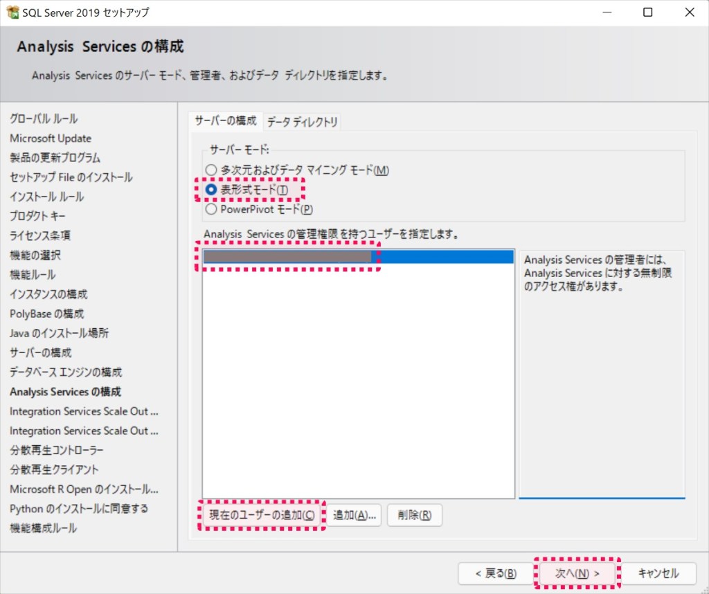 「サーバーモード:」は初期選択「表形式モード(T)」のまま、「現在のユーザーの追加(C)」ボタンをクリックして「Analysis Servoces の管理権限を持つユーザを指定します。」の領域にユーザが追加されているのを確認したら「次へ(N) >」ボタンをクリックします。