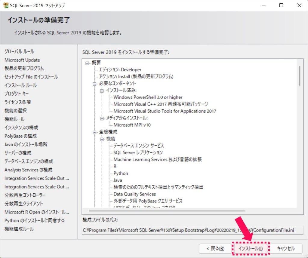 SQL Serverのインストール準備が完了したので「インストール(I)」ボタンをクリックします。