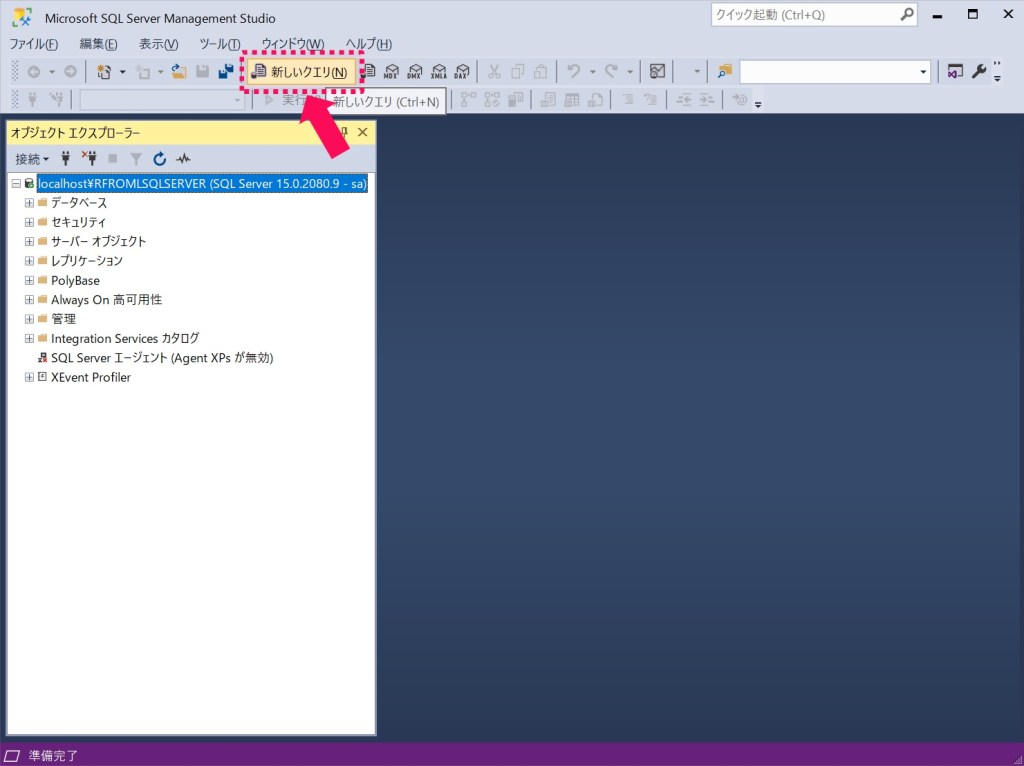Microsoft SQL Server Management Studio の画面で「新しいクエリ(N)」ボタンをクリックします。